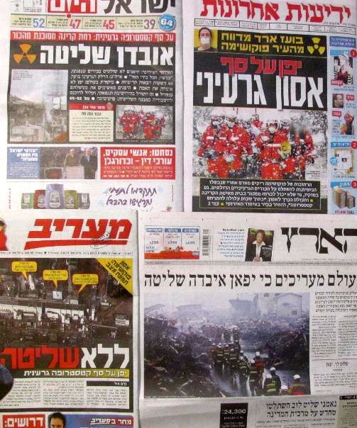 יפן מתמוטטת. גדעון לוי והצלם אלכס ליבק, שליחי הארץ, חוזרים * בועז ארד ואסף שפריר מידיעות ומעריב – שם * עובדי מעריב שעברו שימוע השבוע קיבלו אתמול את מכתבי הפיטורים * nrg מרוקן מערוציו * ישראל היום חוגג את האמל"ח שהוברח וידיעות שופך מים קרים על ההתלהבות