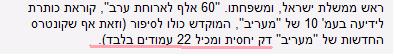 הארץ נשאר הארץ. שום רמז בשער, בלי לריב עם קשת, אבל זו הכתבה הפותחת בעמוד חדשות תרבות ובידור (טור אישי של רועי ארד שהגיע עד לנווה אילן). ארד לא צפה בתוכנית, שהרי לא ידע מיהו המתנחל המודח, יורם כהן. הוא גם לא מכיר את סקולי הכבש של ג'קי ולכן כותב שהוא מלטף עז. או שאולי זה לא קשור לידע באח אלא בזואולוגיה. בעמוד קודם יש מאמר של נחמיה שטרסלר. כן, הוא. המאמר מתחיל בע' 11 והמשכו בע' 10. גם זהו חידוש. שטרסלר קורא לעז/כבש תיש ומסכם ב: