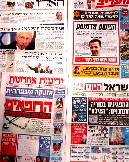 הראשית במעריב מופנית לאסד: "הפושע מדמשק"; ישראל היום: "מפגינים בסוריה מתחננים הצילו"