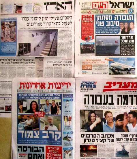 הכותרת הראישת של הארץ שונה, שזה משמח, אבל למה להעניק לפעולות הקיצוניות והחריגות האלו כות' ראשית?: "השב"כ: פעילי ימין קיצוני עברו לפעל כתאי טרור מאורגנים". וללוחמים האמיצים: למה לטנף חדרי מדרגות?
