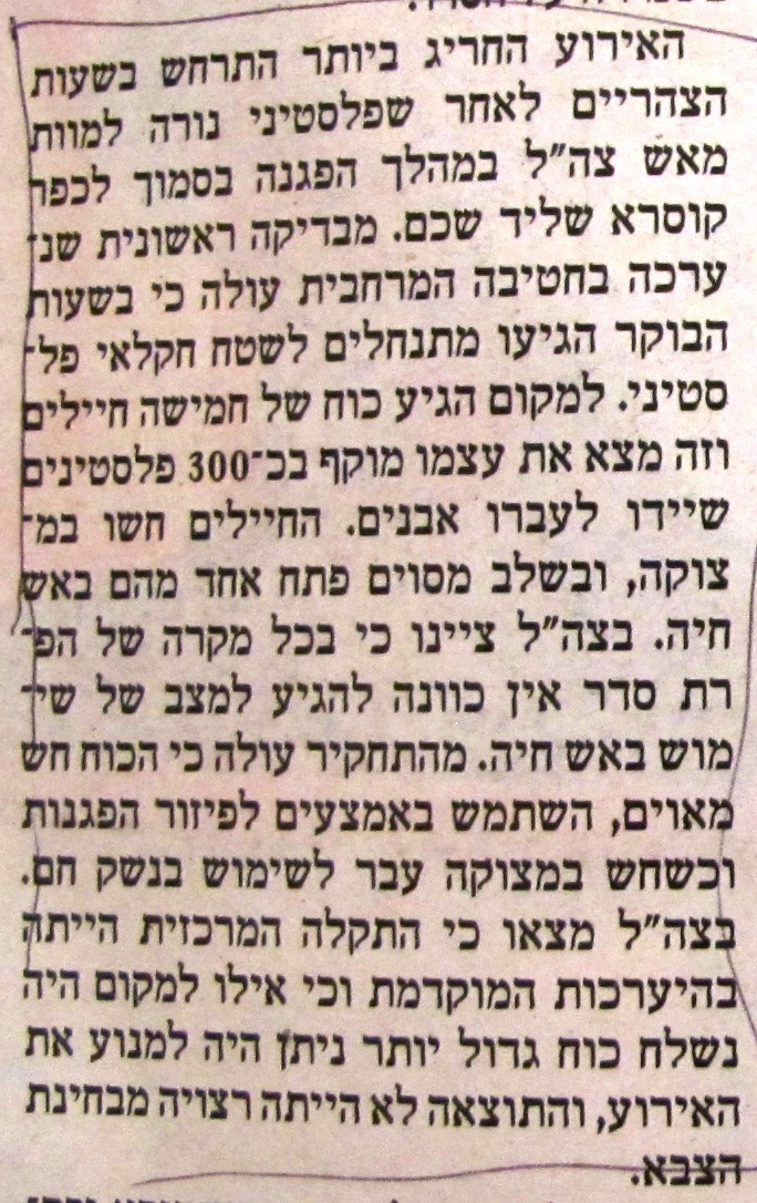– מותו של עיסאם עודה (או עיסאם בדראן, אתמול) מכפר קוסרא או קוסרה, בן 36 או בן 34, מופיע במעריב ככית' תמונה בע' 8. מצה"ל נמסר "הנושא בתחקיר משותף של צה"ל ומנגנוני הביטחון הפלסטינים".