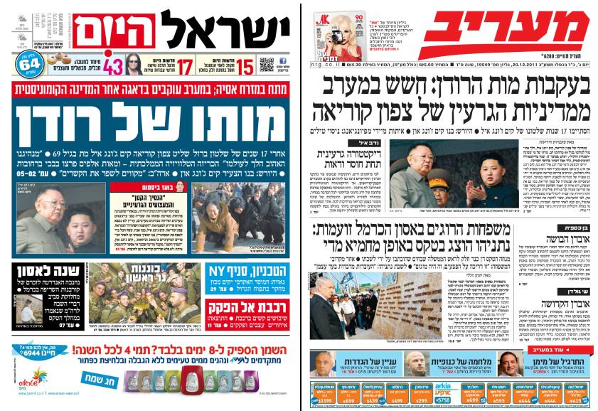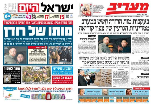 הארץ, ישראל היום ומעריב בווריאציות שונות בראש השער על מותו של הרודן הצפון קוריאני. בידיעות מתארגזמים מהנרקיסיסט המקומי, ואף משווים בין השניים. במקור ראשון הידיעה על מאחז רמת גלעד היא המסעירה את עורכיו.