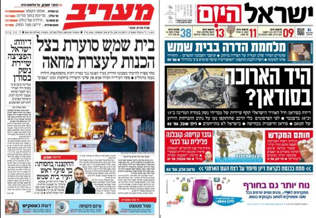בידיעות, התקיפה מגיעה רק בע' 6 (במעריב 8-9). על פי פרסומים שם, חיל האוויר הפציץ החודש שיירות נשק שהיו בדרכן לעזה. באותה עת "במקרה או שלא במקרה", כותב אלכס פישמן, שהה נשיא דרום סודאן, סלבה קיר, בביקור בישראל.