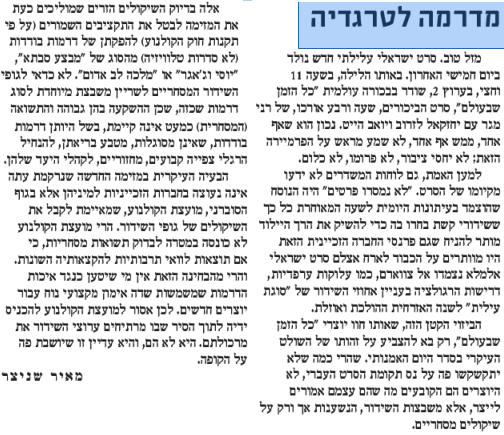 לצד המאמר של מאיר שניצר על טרקובסקי מופיע גם מאמר מערכת של המוסף, חתום על ידי אותו שניצר. מאמר נכון ומדויק על הדרת הסוגה העילית בטלפיסיון, והרבה יותר קומוניקטיבי מסרטי טרקובסקי.