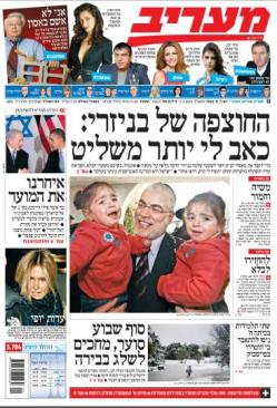 דיסוננס בשער מעריב: מצד אחד, מוענקת לאיש הנאלח כותרת ראשית המגנה את דבריו. מצד שני, תמונה משפחתית עולצת עם תאומים או תאומות בסוודרונים אדומים.