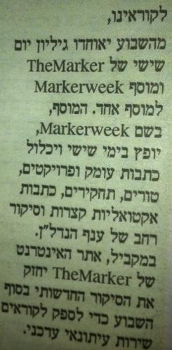 מארקרוויק – היה ל״קוראינו״ ביום ה׳. חדשות הכלכלה נעלמו ביום ו׳ והקוראים הופנו לאתר האינטרנט! הרעיון ניתן כמובן להרחבה לשאר העיתון ..
