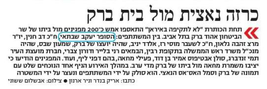 באותה כפולה, 4-5 יש גם כיתוב תמונה של הפגנונת שנערכה אמש מול ביתו של ברק במגדל ג'י בת"א. כמה אנשים היו שם? לא ברור. מה שכן, אחד מהן, שהניף תמונה של ברק לבוש במדי SS עם צלב קרס עוכב לחקירה.