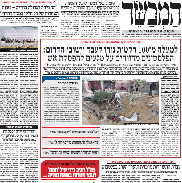 בהארץ הכות' הראשית "בישראל דנים בחידוש חיסול ראשי חמאס". תצלום השער יותר בכיוון הארטי: שוטר בוחן זירת נפילה. פריים מנוכר יותר: אין אמהות ותינוקות, אין גם בית שהתקרה שלו נפלה. הכל יותר כירורגי ומנוכר.