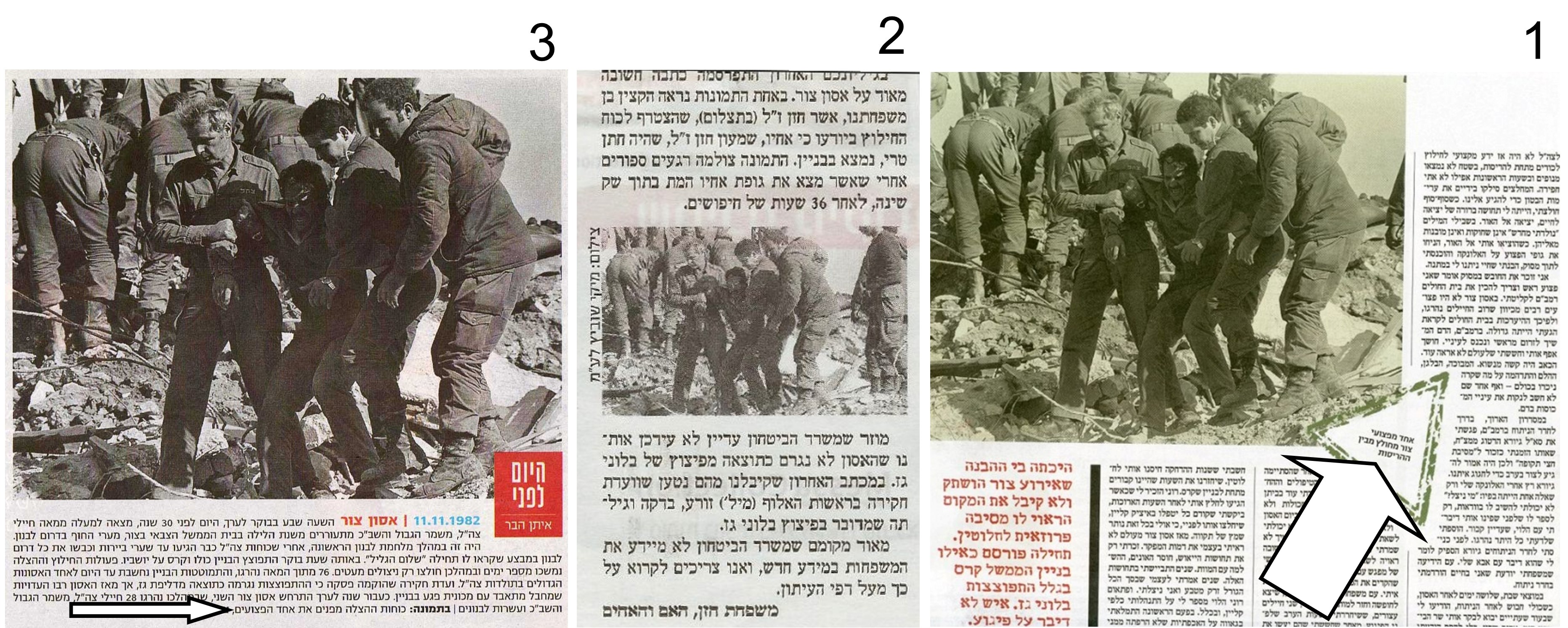 …כעבור שבוע, ב"מכתבים למערכת"… תגובה ממשפחת חזן שלא מדובר בפצוע אלא בקצין בן המשפחה, שהצטרף לכח החילוץ, ביודעו שאחיו נמצא בבניין. התמונה צולמה רגעים ספורים אחרי שמצא את גופת אחיו המת בתוך שק שינה. התקבל הרושם שפירסום התגובה (וצרוף התמונה לתגובה) בא על מנת להודות בטעות ולהביא את הדברים לידי תיקון. מסתבר שהעורכים בידיעות כנראה אינם קוראים את הדברים המתפרסמים אצלם. אחרת קשה להבין כיצד חזרה אותה טעות.