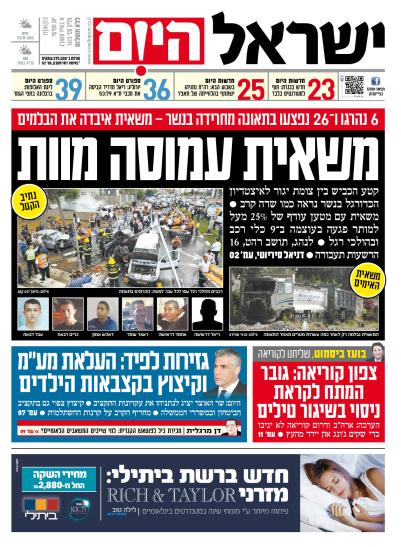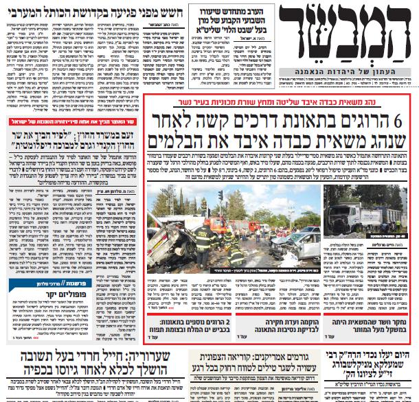 בדר"כ בהארץ לא מתרגשים במיוחד מתאונות דרכים. אבל הפעם זו התמונה המרכזית בשער, כמו בשאר העיתונים, ידיעה שנייה בעמוד, וכן כל ע' 4 עוסק בתאונה.