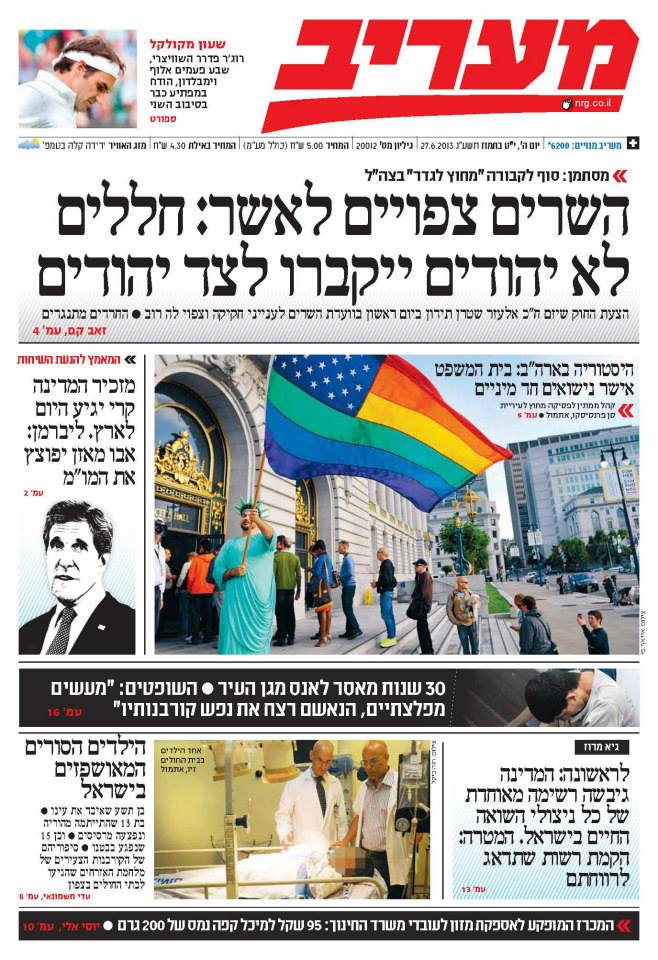 במעריב אף בידיעות, הפסיקה ההיסטורית של ביהמ"ש העליון בארה"ב, שביטל את החוק הקובע שרק גבר ואישה יכולים להינשא, ולמעשה התירה בכך נישואים חד מיניים מככבת בשערים. במעריב (ע' 6-7) וכך גם בידיעות. בשער מעריב החגיגה גדולה יותר. הופעתי מכך שבמקור ראשון יש הפניה בשער לידיעה.