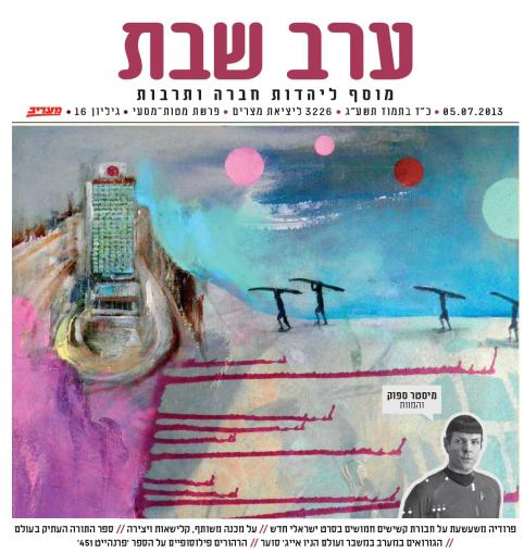 שער המוסף עם כותרת נחמדה, "רעליטי". רז שכניק על כך שהריאליטי חולש על רוב החלקות שרגל הצופה דורכת בהן בטלוויזיה. לא שאני לא מסכימה, ולא שאני לא מחרימה כל ריאליטי שהוא באשר הוא, אבל התחושה המתקבלת בכתבה רבת האזכורים היא שבואו ננקנק את קשת, אבל בלי שירגישו, במעטפת כזו של כולנו רוצים סוגה עילית והטלוויזיה לא נותנת לנו. והאח הגדול. ורוני מיילי (נתקלתי בשם), וכוכב נולד.