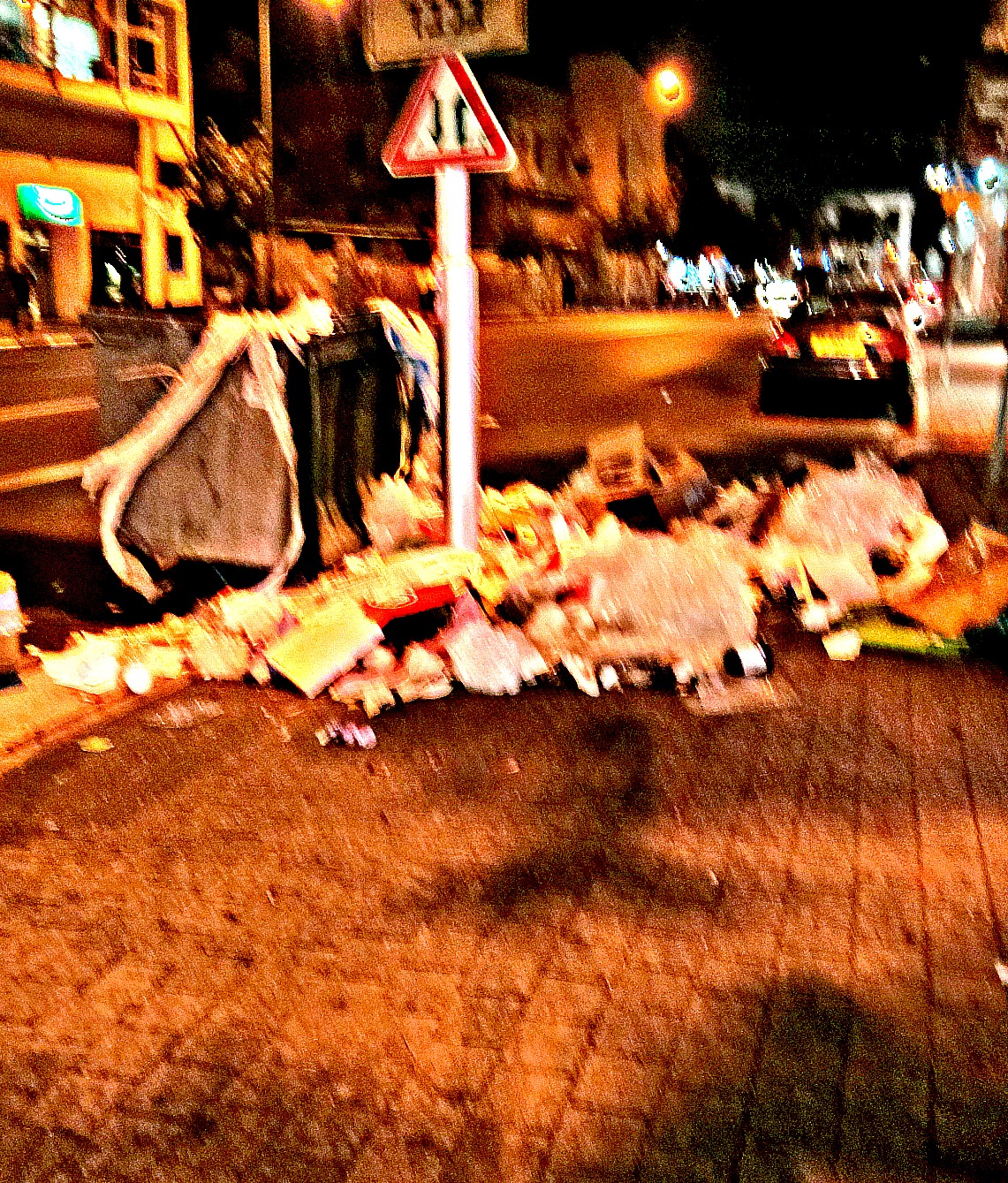לאחר שהגדלתי את התמונה ובעין לא מזוינת מצאתי שהמיכל אינו מלא ואולי אפילו ריק, ומישהו שבדק את תכולתו השאיר את השיירים על המדרכה. כמו כן המדרכה מרוצפת באבנים נאות ומסוגננות והתאורה טובה, כך שהזנחה אין פה. צריך להחליף את התושבים.