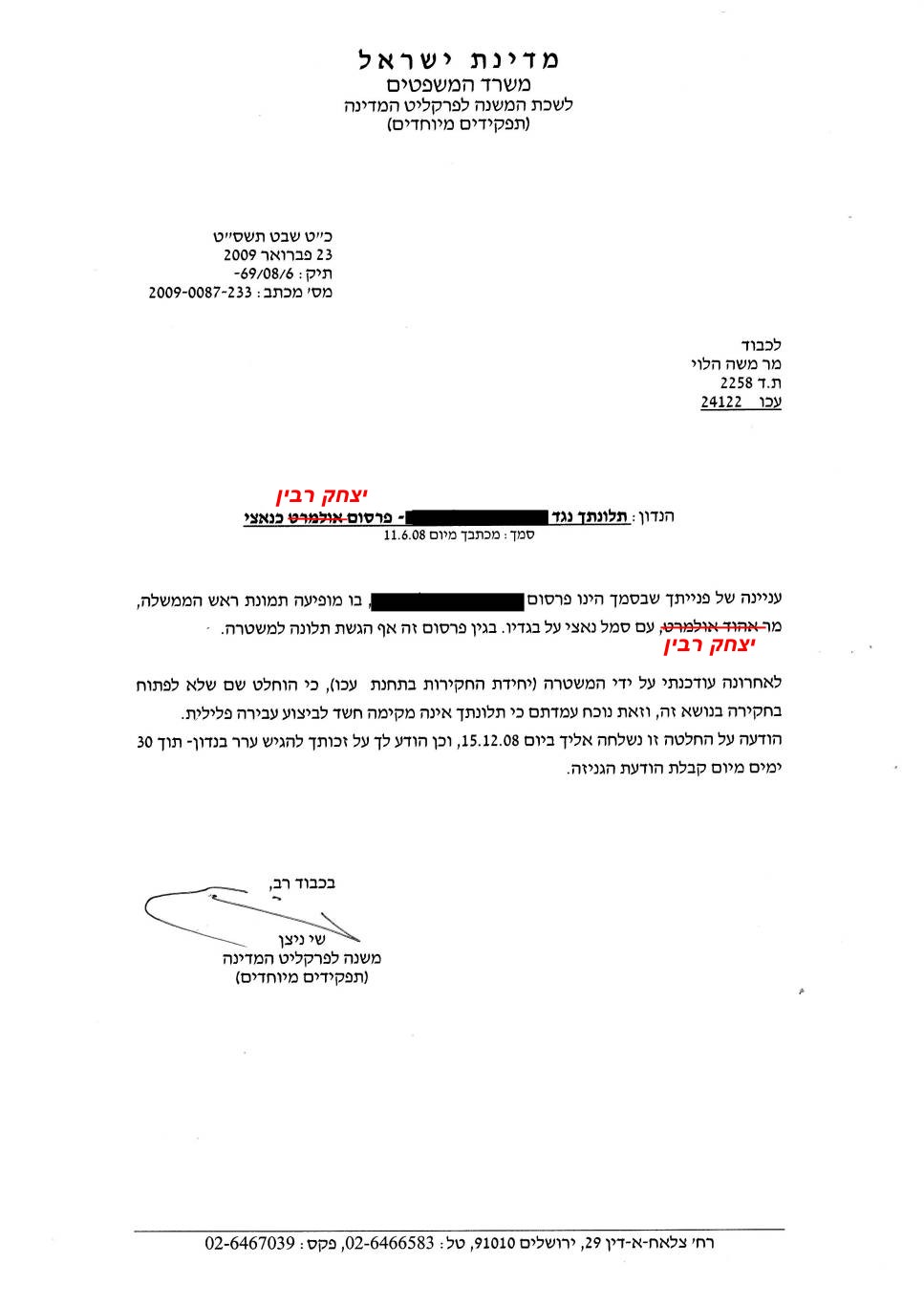 פרסם תשובה שקיבל משי ניצן (בונד, תפקידים מיוחדים) לגבי לתונה שהגיש בעקבות פרסום ראש ממשלה בישראל במדים נאצים.