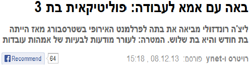מעניין (אך לא מפתיע) המקום הנרחב שניתן לידיעה הדי-מינורית אודות הצינור שיזרים קצת מים לים המלח (שביעית ממה שנדרש כדי לעצור את ירידת המפלס, כותב צפריר רינת, ואני מקווה שגם הנזק שייגרם יהיה מצומצם בהתאם). הידיעה מדגישה מאד את תפקידו המרכזי של כבוד השר לפיתוח הנגב ולשת"פ איזורי בהסכם, וכרגיל עולה תהיית הביצה והתרנגולת: מה קדם למה – האמונה של המוזסים בכך שהנציג הגלוי של המשפחה בפוליטיקה עשוי לנצח את נתניהו יום אחד, ומכאן הנסיון המתמיד לרומם את האחד ולגמד את השני, או שמא האיבה לנתניהו היתה קודם ובלי תלות בסילבן שלום-ניר-מוזס והקמפיין המתמיד נגד נתניהו הביא לכך שמישהו שם חושב שלסילבן יש סיכוי?