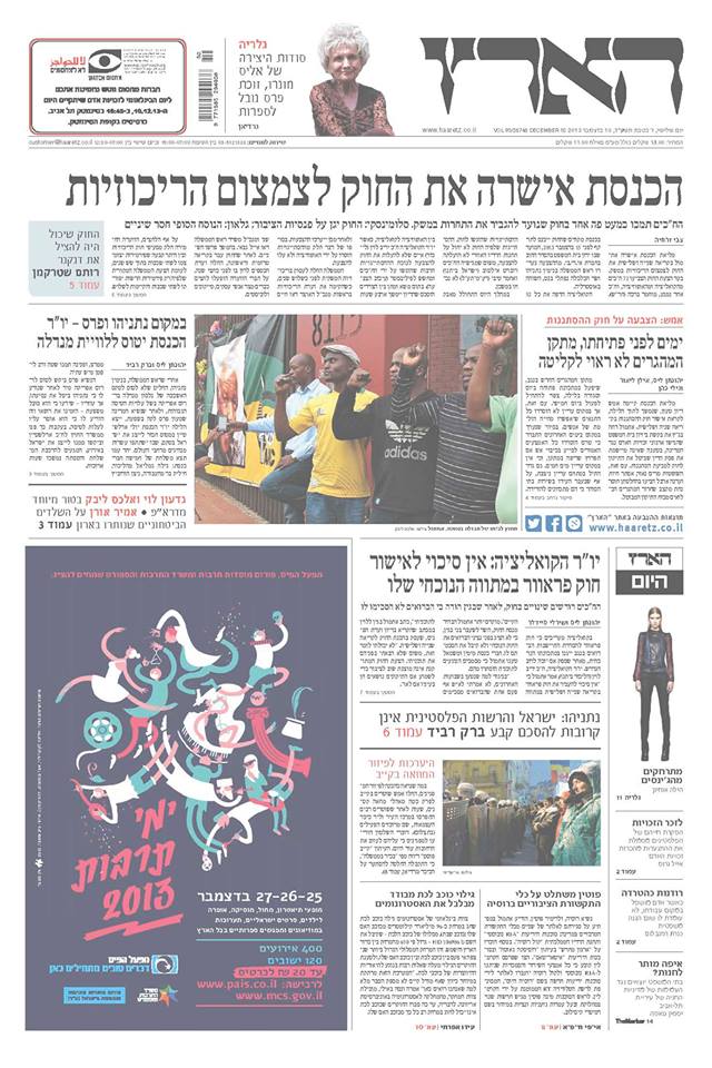 …מה שקובע כנראה שיא אירוני חדש, הוא שהיעדרותו של נתניהו מהטקסים לכבוד מנדלה אפשרה לו לפקח בכנסת על תרגיל החקיקה של חוק ההסתננות – החוק שיאפשר לשלטונות לכלוא מבקשי מקלט מאפריקה עד שנה בלא משפט וימנע מהם לעבוד בישראל. רק בחודש האחרון אישר הקבינט תקציב של 440 מיליון שקלים למימון דרישות החוק הזה. סכום זה גבוה פי 60 מההוצאות שהיו כרוכות בנסיעתו של נתניהו להלוויית מנדלה. מעולם לא שלח נתניהו מסר כה מכעיס בהצלחה כה ברורה (ברדלי ברסטון, הארץ).