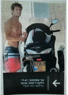 התצלום השני יותר מסעיר: עפר שכטר בבגד ים, פלג גופו העליון חשוף ליד הקטנוע שלו (דנה קופל צילמה). מאחר שאני מאוד מעריכה את מפעלו האמנותי והתרבותי הזה של שכטר – טיפוח הטורסו והשרירים היפהפיים שבצדי הבטן (השרירים האלכסוניים? הוא בן 34, יש לו שנים ספורות ליהנות מהם*) – הבטתי ממושכות בתצלום ותהיתי מה לברנע ולשכטר. ההתפקד למפלגת קש כלשהי? שתי העמודות האחרונות במדור מוקדשות למשפט תעבורה של שכטר בו זוכה אחרי שהואשם בנהיגה תחת השפעת אלכוהול. מטעם שכטר העידו רותי רודנר וגיא פינס, שהיו איתו במכונית. שכטר זוכה בסוף (טען שיש לו אסטמה, דלקת ריאות, לא יכול לנשוף, לא משנה). בסוף מפגין ברנע יכולות שיטוט בפייסבוק ומציין שבעמוד הרשמי שלו מצולם שכטר כשהוא גולש בים, ומקווה שהוא יכול לשאוף ולנשוף, לפיכך. ברנע רצה לומר, כנראה, ששכטר זוכה שלא בצדק.