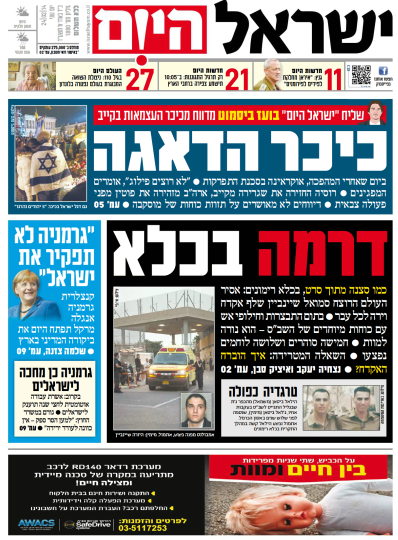 הקנצלרית הגרמנייה אנגלה מרקל, מלווה ב-16 שרים, תגיע הערב לירושלים. המטרה: לפוגג את המתיחות בין שתי המדינות ולהדק את שיתופי הפעולה. בידיעות מכינים לה קבלת פנים נאה עם כותרת בגרמנית (לטקסט של שמעון שיפר): Willkommen, Angela.