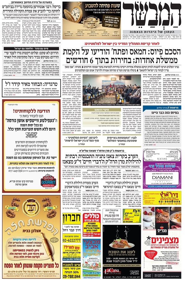 בכפולת 2-3 בידיעות כותרת הא ודא: "הפיוס והזעם" על האחדות הפלסטינית בין פת"ח וחמאס שהסכימו על הקמת ממשלת אחדות פלסטינית: נתניהו שוחח על ההתפתחויות עם ג'ון קרי… בירושלים הופתעו… בירושלים ובוושינגטון הגיבו בחריפות. אלכס פישמן: "בישראל מתפוצצים מכעס… בעיקר מההתייחסות האמריקאית למהלכים החד צדדיים של היו"ר".