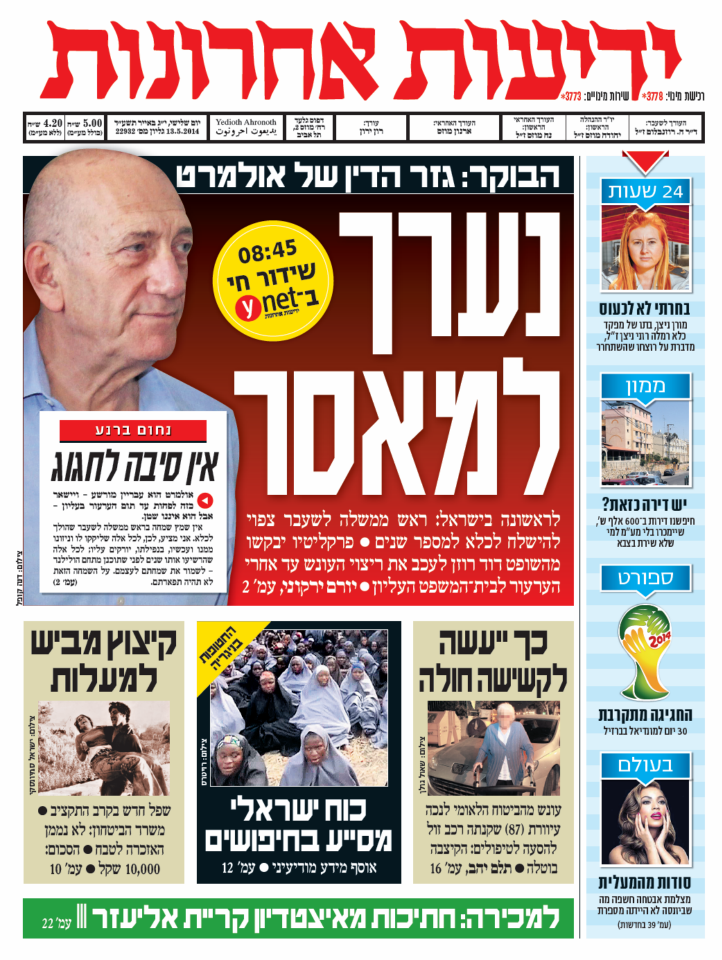 בלית ברירה, זו הכותרת הראשית גם בידיעות: "נערך לכלא". בשער ובראשית הכפולה הפותחת נחום ברנע מיישר קו וכותב ש"אין סיבה לחגוג". זה אותו ברנע שהודה בפה מלא, שידיעות נוטה אולמרטה: