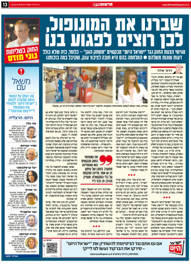 מעבר לכך קיימת הקביעה השקרית של ישראל איום, כאילו הם באו "לשבור את המונופול של ידיעות". איזה מונופול בדיוק? זה שהיה לידיעות עם מעריב? זה שהיה לו עם הארץ? זה שהיה לו עם אצבעוני וסלעית? או אולי הקנוניה המשותפת עם פנדל ונאשה-סטרנה?