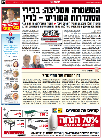 למה הכוונה? להסתדרות המורים. מרדכי גילת מסביר: ישר"ה חושף את השחיתות וידיעות יוזם את פרויקט המורה של המדינה ומשתף פעולה עם יו"ר הארגון, יוסף וסרמן. בהמשך הטור של גילת (תחילת העמוד המודפס) מובאים דברי הכתב הפלילי, איציק סבן, המתאר את החקירה.
