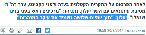 שימו לב: גם בידיעה הזו ב-nrg מ-20.7 בערב, המשפט, הנכתב כציטוט מפי יעלון, מופיע בכותרת המשנה. אין לו זכר בידיעה של אריאל כהנא.