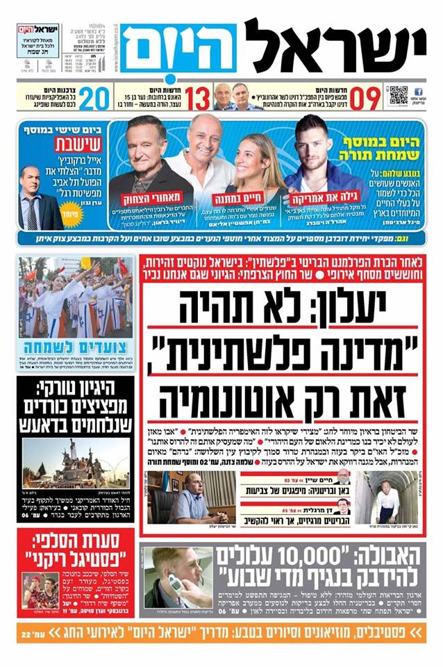 ♦ הנה שלוש הכותרות הראשיות של שלושה עיתונים, הראיון עם שר הביטחון, עיתון עיתון לפי אינטרסיו השקפקפים. למה בכלל שלושה עיתונים מראיינים את יעלון? הרי הוא התראיין לפני כחודש לטלוויזיות, ולמעשה הוא לא מפסיק לדבר. היחיד שלא הלך בתלם היום הוא ידיעות. נחמד מצדו: