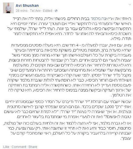 אבי שושן (דובר במשרה מלאה בגוף הציבורי ביה"ח איכלוב) ומבקר מוזיקה (בגוף תקשורת פרטי ynet), יצא הכי קטנוני ועלוב בעולם. כנראה הייתה אי הבנה בין הצדדים, וכיסא הגלגלים הוחזר ( אך לא על שם מי ששילם פיקדון עבורו, ולכן בטעות חוייב אבי שושן כספית). 1,000 הש"ח ששילם (וכעת זוכה) לא מצדיקים את פירסום המקרה וחשיפת צינעת הפרט של אריאנה מלמד ובן זוג הפצוע. לצערי נפצעתי קשה לפני שנה ונעזרתי כמה חודשים בכסא גלגלים, הליכון, קביים וכו', שהושאלו מיד שרה. אנשים שונים השאילו עבורי את הציוד (אח שלי, בן שלי, חברים וכו') לעיתים מסניפים שונים של יד שרה, ונוצר בילבול לפעמים בהארכת הציוד או בהחזרה שלו וזיכוי כספי. אבי שושן לא צריך היה להתלהם ולפרסם פומבית את המקרה. נאחל בריאות מלאה לכולם.