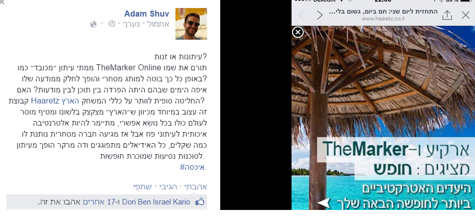 עוז זהבי מתקוטט עם הארץ בפייסבוק.