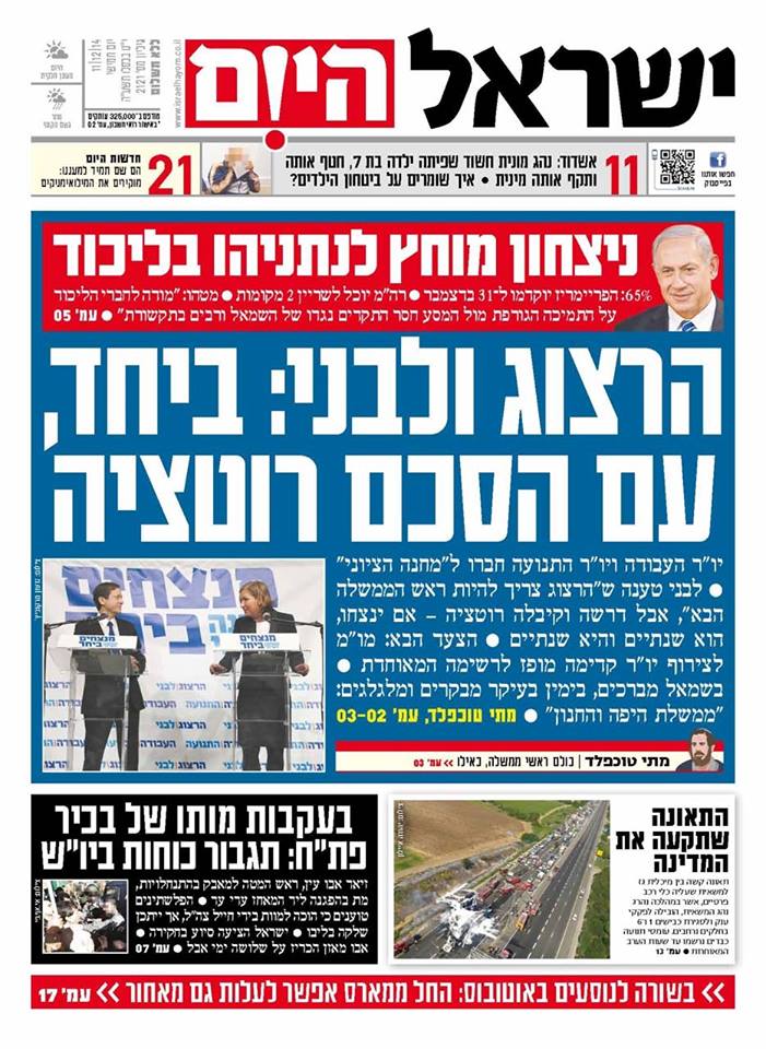 ♦ כותרות ראשיות אחידות בכל העיתונים, על האיחוד והרוטציה בין ציפי לבני לבוז'י הרצוג.