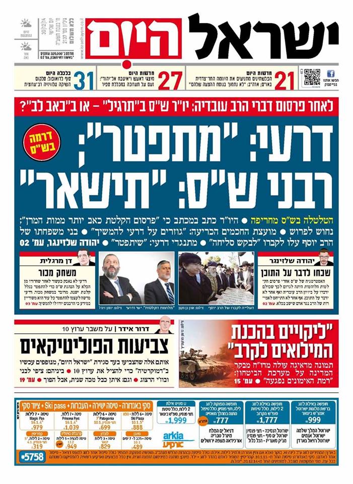 ♦ יש"רה מוצא לנכון לקנטר את ידיעות, כמובן. כותב יהודה שלזינגר בע' 2 שבידיעות כתבו על דרעי "בעמודים האחוריים הרחוקים הצנועים". טוב, ע' 6 זה לא "אחוריים רחוקים צנועים". למה להגזים סתם? דן מרגלית חזק בלגלוג. לסיכום, הכפולה הראשונה של ישר"ה יורדת על דרעי ועל ידיעות מיטיבו.