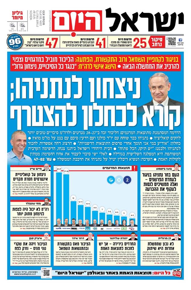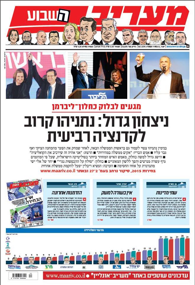 ידיעות, בכותרת הראשית שלו, עדיין חי את הפנטזיה: "קרב צמוד". איזה צמוד ואיזה נעליים. ישר"ה שומר על איפוק: רק "ניצחון לנתניהו" (ובאתר, בהמשך, "ניצחון סוחף"), בעוד מעריב עם "ניצחון גדול" (ובאתר, בהמשך, "ניצחון ענק"), והארץ עם "ניצחון משמעותי". מעניין, לא?